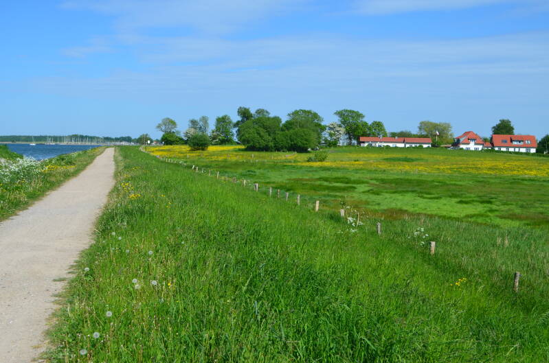 Bei nur schwachem Wind aus SO und viel Sonne verlassen wir Fiskenæs. Auf der Außenförde halten wir uns südlich außerhalb des beachtlichen Verkehrs Richtung Sonderburg und Ostsee. Nach guten 15 sm laufen wir in ein. An der Ostseite des Yachthafens ist der ehemalige Fähranleger der Verbindung nach Faaborg, die 1999 eingestellt wurde. Dort gibt es jetzt Liegeplätze für grosse Traditionsschiffe und Charterboote. Im Hafen sind die kleineren Boxen innen auf der Westseite. Es sind nicht viele freie Boxen zu finden aber nachdem wir einmal verholen mussten weil der Liegeplatzinhaber vergessen hatte auf Rot zu stellen, finden wir gegenüber gleich am Anfang des Stegs einen Platz mit Blick ins Grüne. Der ganze Weg entlang der Stege ist eine nett angelegte Grünanlage mit Bäumen, Rasen und Grillplätzen. Am Ende des Hafens führt der Weg weiter am Wasser entlang und lädt zu schönen Spaziergängen mit viel Aussicht und Landschaft ein.
